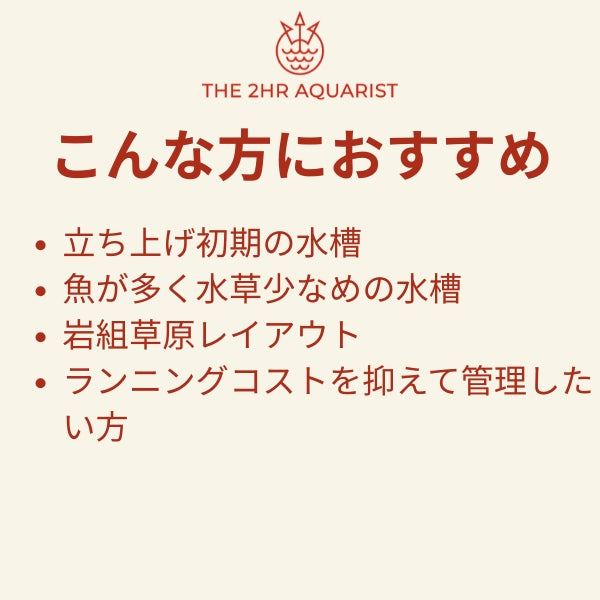 水槽立ち上げ初期(3ヶ月未満)の不安定な時期でも使いやすく、コケを増やしにくい設計 のため、初心者の方にも安心しておすすめできます。